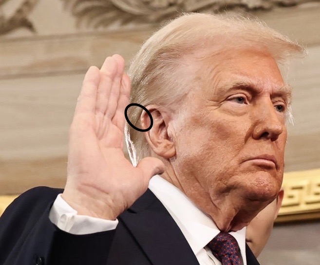 OK, but what about the scar-free ear? The doctor who treated Trump described the wound as being in the cartilage on the outer edge of the ear. A reporter for the New York Magazine (a slightly left-leaning publication, so not necessarily a fan of the orange idiot) inspected his ear and described it as follows: “on the tiniest patch of this tiny sculpture of skin, a minor distortion that resembled not a crucifixion wound but the distant aftermath of a sunburn.” So, she saw a scar. Tiny, but a “distortion”. In the picture, taken at his inauguration, that accompanies this article, you can see a minor blemish at about 11 o’clock on the outer edge of his ear. So, the lack of scar? Sorry – the fact that the scar is extremely small doesn’t matter. There is a small scar. I’m convinced that a bullet nicked his ear, and that he was luckier than the rest of the world on that day.